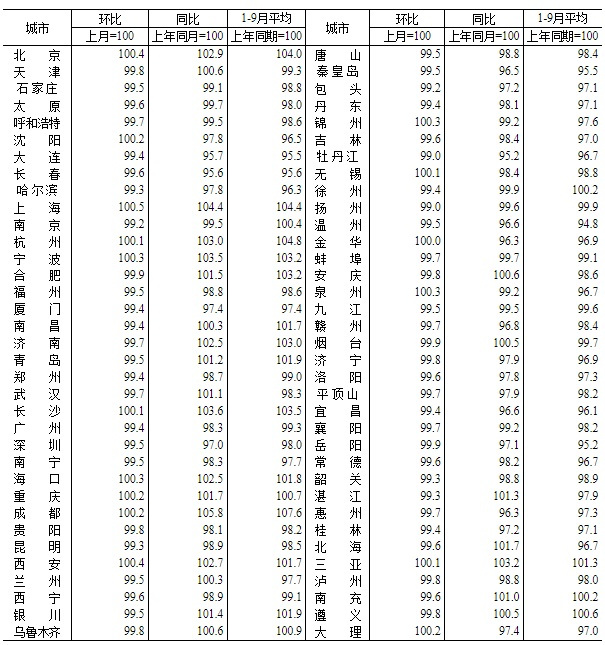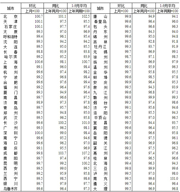 国家统计局公布的9月70个大中城市新建、二手价格情况显示,70个大中城市新建商品住宅中,16个城市房价上涨,54个城市房价下跌;二手房方面,5个城市房价上涨,65个城市房价下跌。