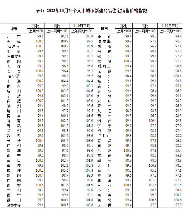 今日上午,国家统计局发布2023年10月份70个大中城市销售价格变动情况。国家统计局城市司高级统计师沈赟解读称,2023年10月份,70个大中城市商品住宅销售价格环比下降城市个数略增,各线城市商品住宅销售价格环比下降、同比涨跌互现。