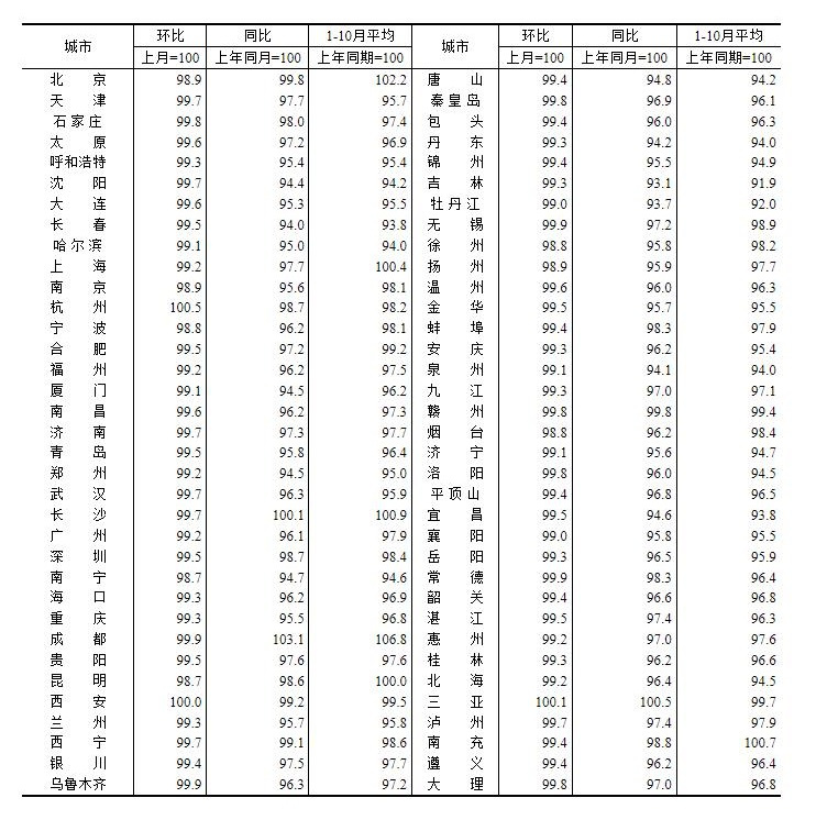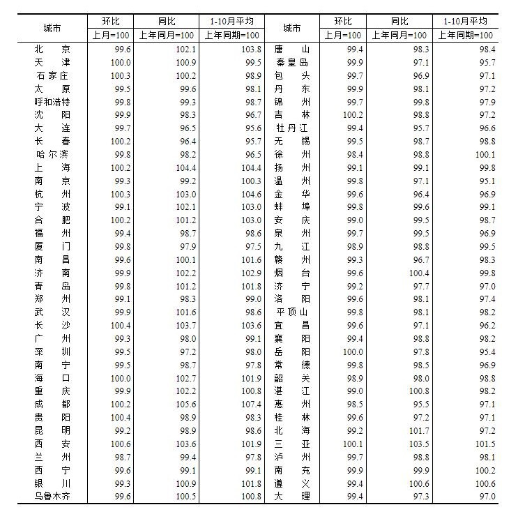 国家统计局公布的10月70个大中城市新建、二手价格情况显示,70个大中城市新建商品住宅中,14个城市房价上涨,56个城市房价下跌;二手房方面,3个城市房价上涨,67个城市房价下跌。