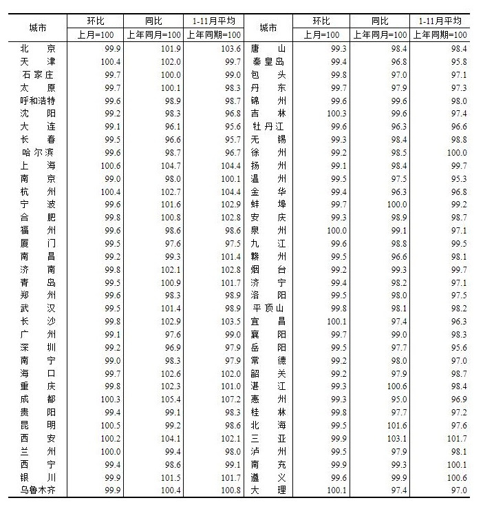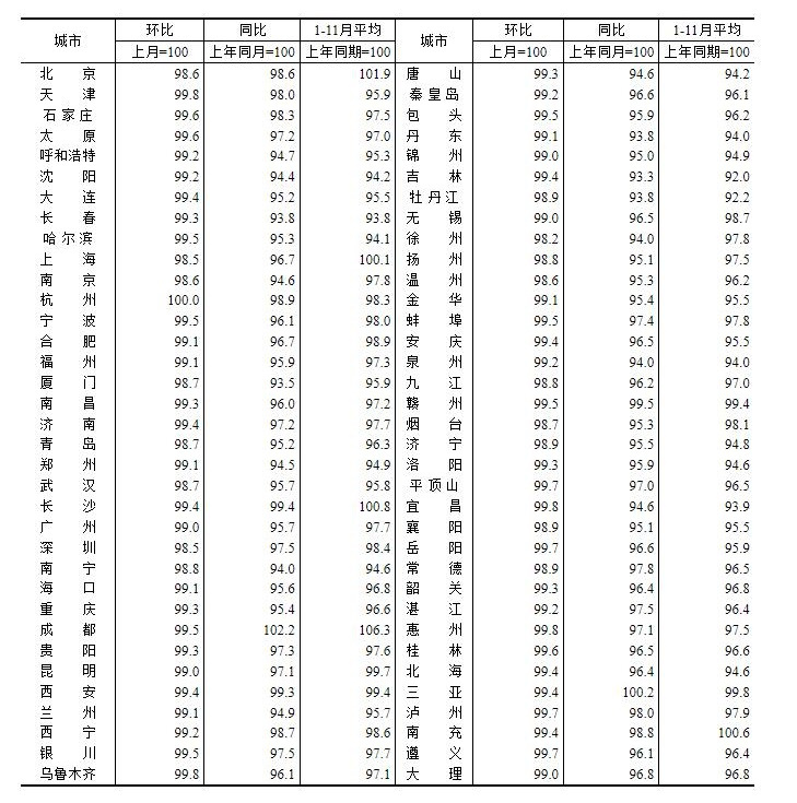 国家统计局公布的11月70个大中城市新建、二手价格情况显示,70个大中城市新建商品住宅中,11个城市房价上涨,59个城市房价下跌;二手房方面,1个城市房价上涨,69个城市房价下跌。