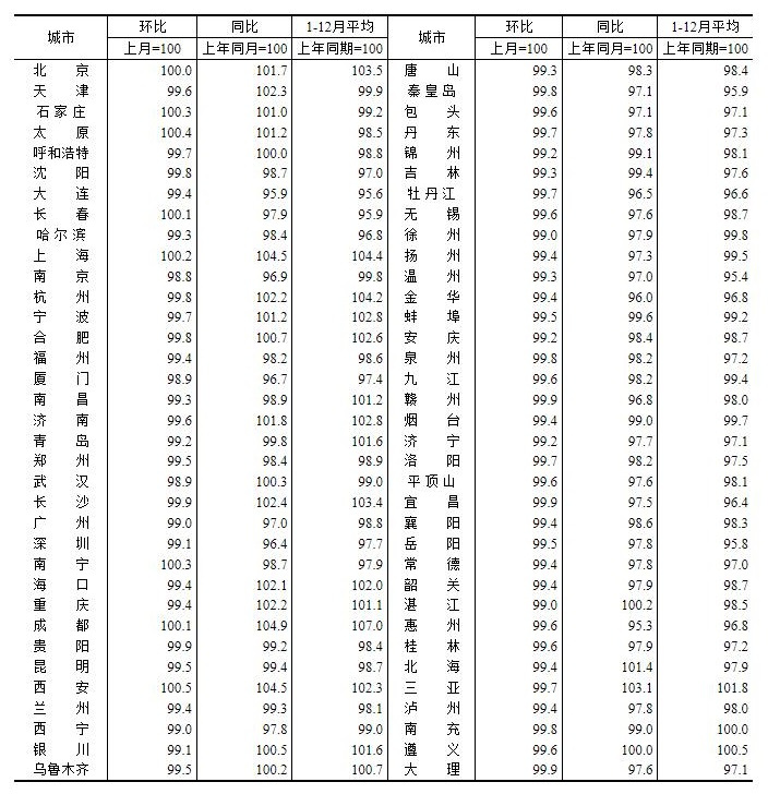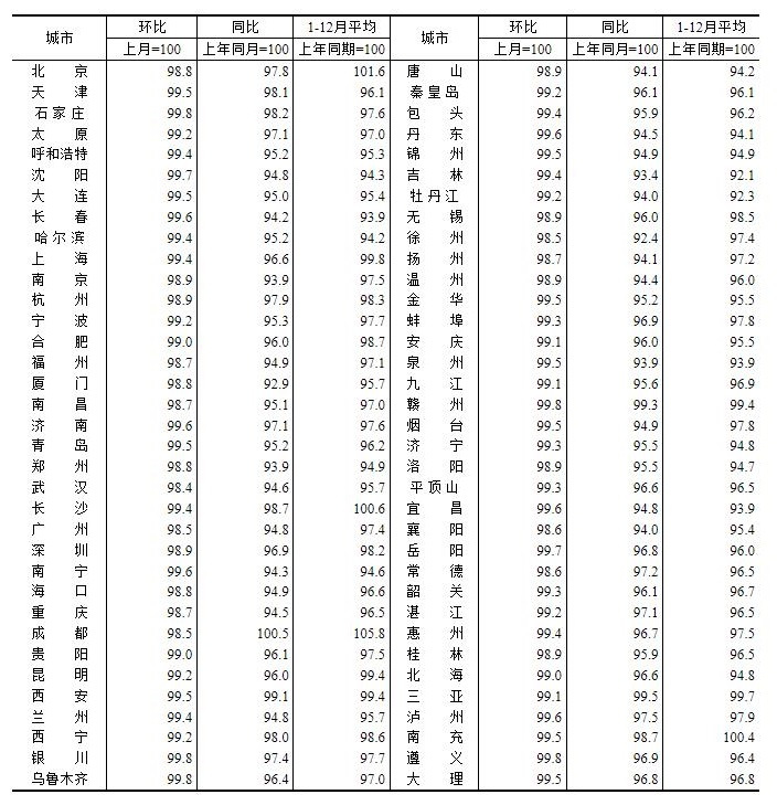 国家统计局公布的12月70个大中城市新建、二手价格情况显示,70个大中城市新建商品住宅中,8个城市房价上涨,62个城市房价下跌;二手房方面,70个城市房价下跌。