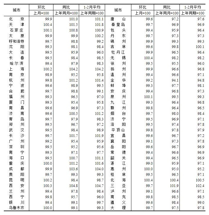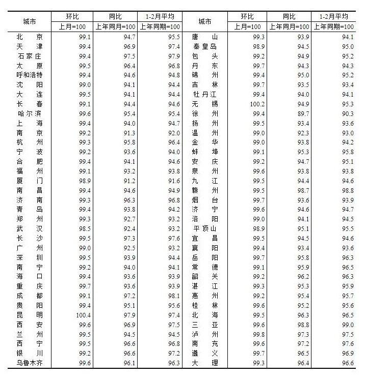 国家统计局公布的2月70个大中城市新建、二手价格情况显示,70个大中城市新建商品住宅中,11个城市房价上涨,59个城市房价下跌;二手房方面,2个城市房价上涨,68个城市房价下跌。