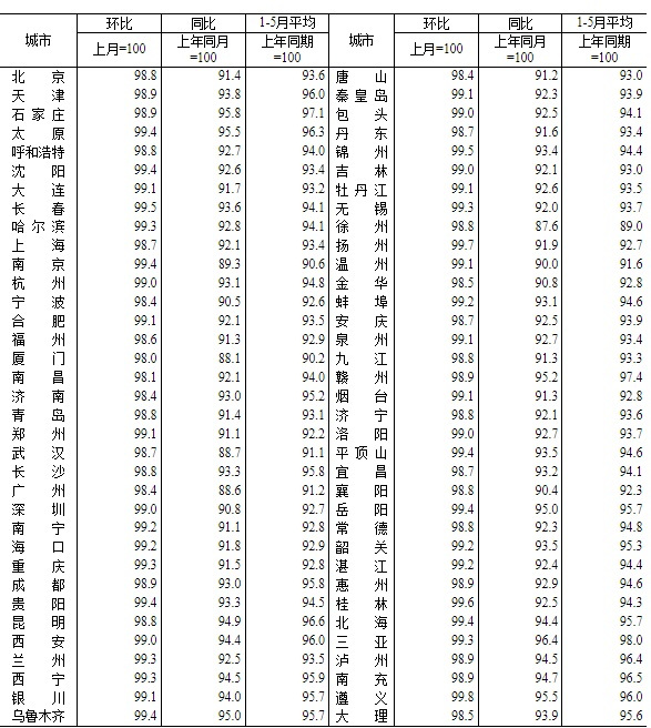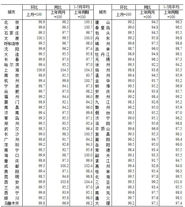 国家统计局公布的5月70个大中城市新建、二手价格情况显示,70个大中城市新建商品住宅中,2个城市房价上涨,68个城市房价下跌;二手房方面,70个城市房价下跌。