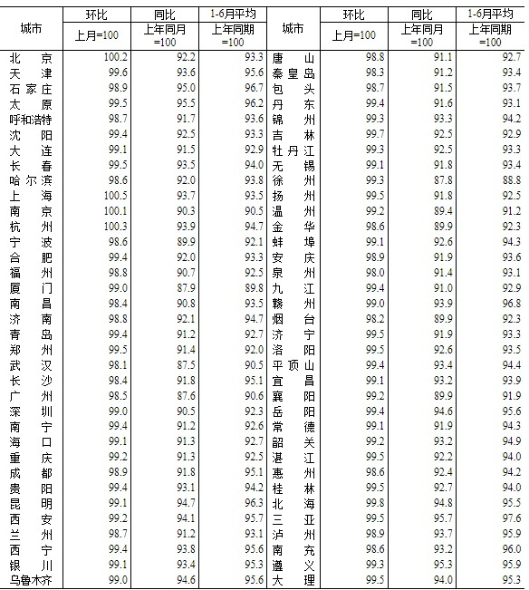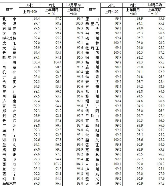 [摘要] 国家统计局公布的6月70个大中城市新建、二手商品住宅价格情况显示,70个大中城市新建商品住宅中,6个城市房价上涨,64个城市房价下跌;二手房方面,4个城市房价上涨,66个城市房价下跌。