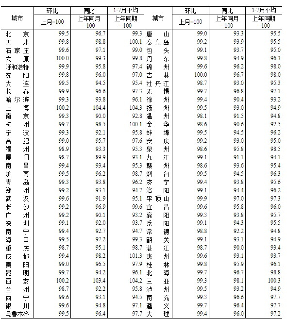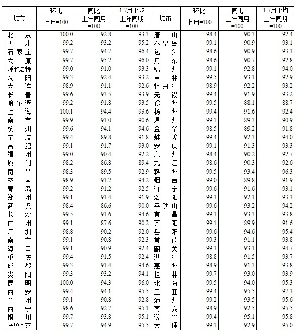 国家统计局公布的7月70个大中城市新建、二手价格情况显示,70个大中城市新建商品住宅中,4个城市房价上涨,66个城市房价下跌;二手房方面,3个城市房价上涨,67个城市房价下跌。